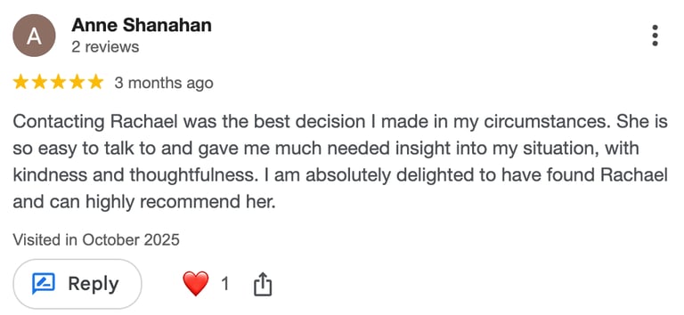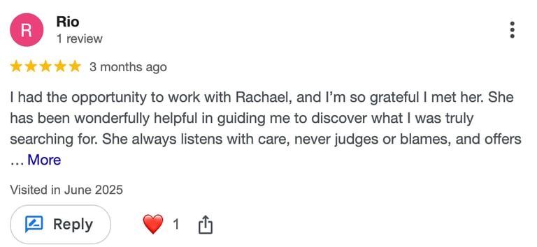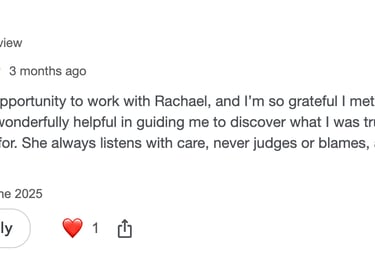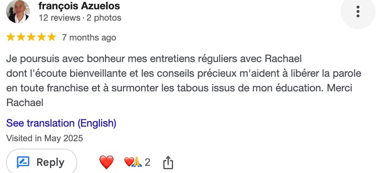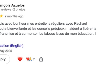 dont l'écoute bienveillante et les conseils précieux m'aident à libérer la parole en toute franchise et à surmonter les tabous issus de mon éducation. Merci Rachael